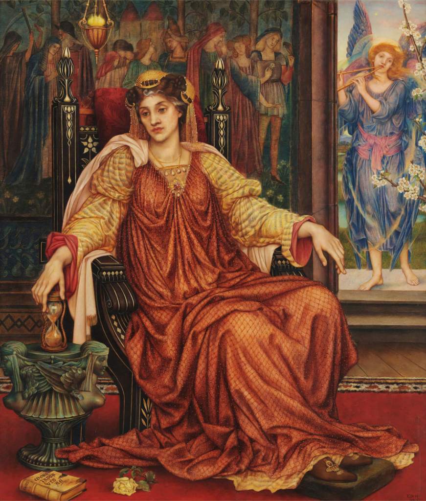 Spiritualist painting referencing ‘Mors Janua Vitae’ (written on the book on the floor): Evelyn De Morgan, The Hourglass (1904)