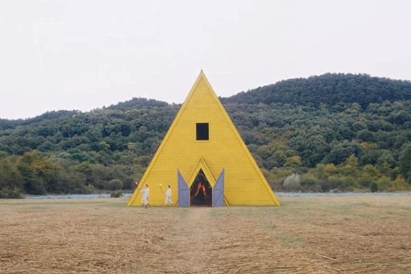 The yellow and blue A-frame building (IKEA vibes)
