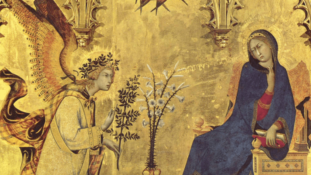 Simone Martini and Lippo Memmi, detail from The Annunciation showing raised gold lettering (1333)